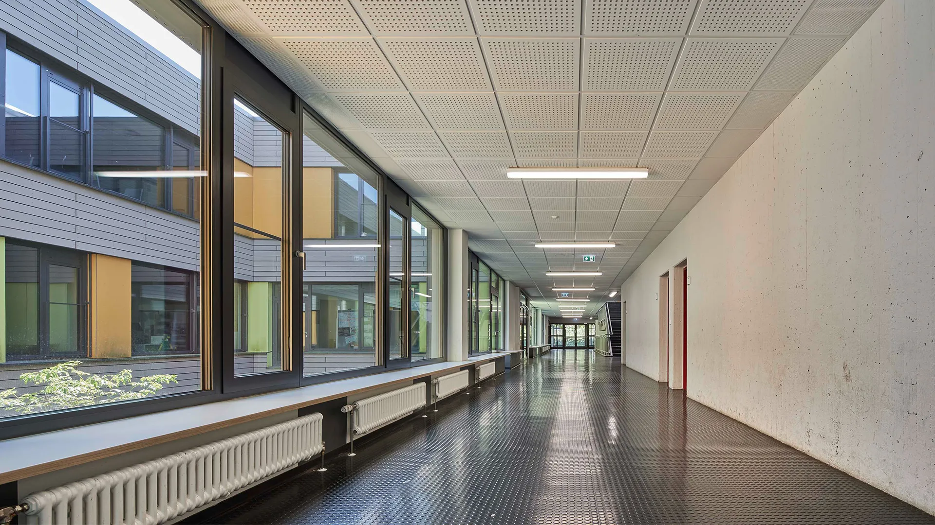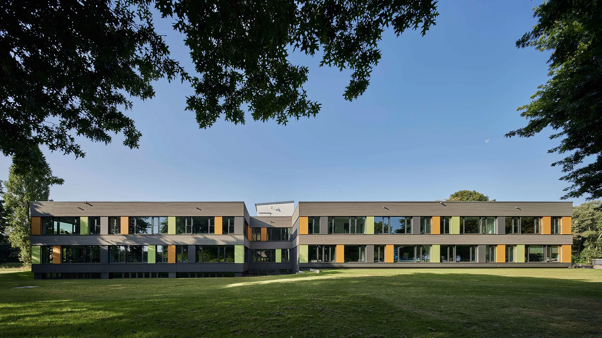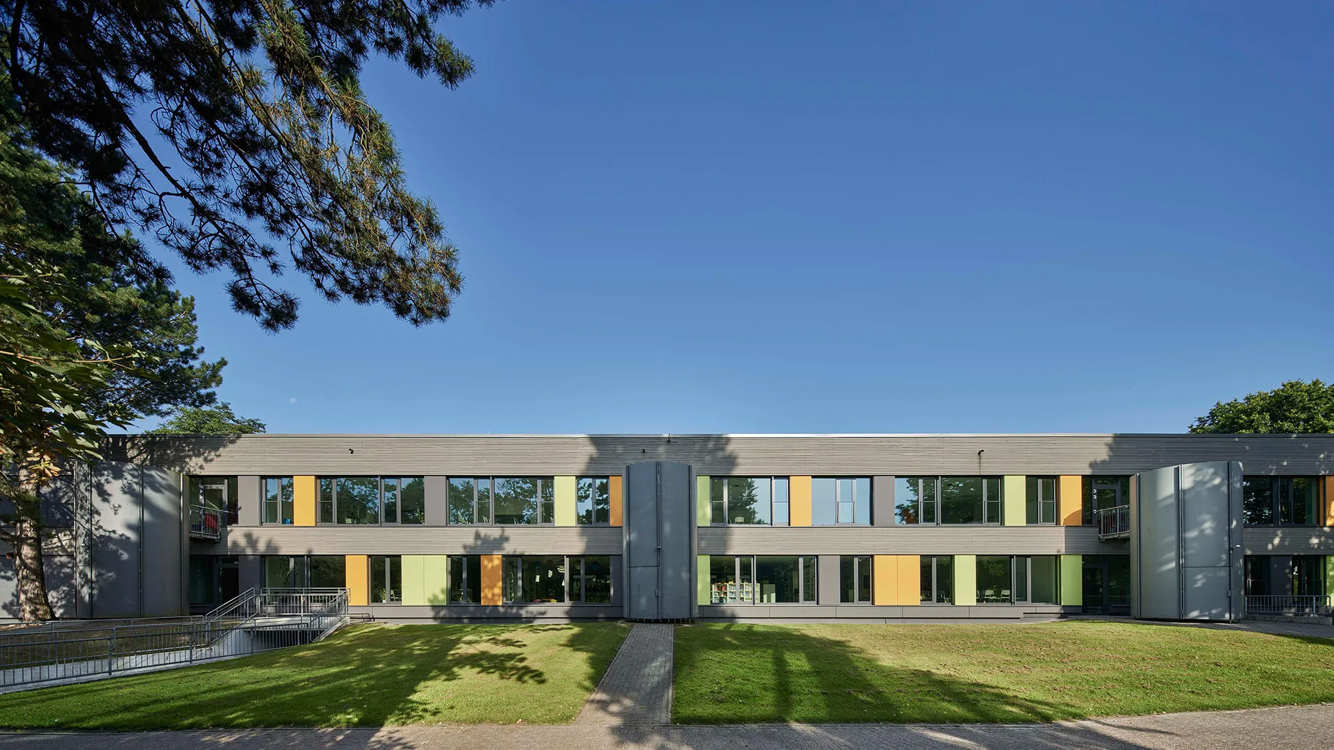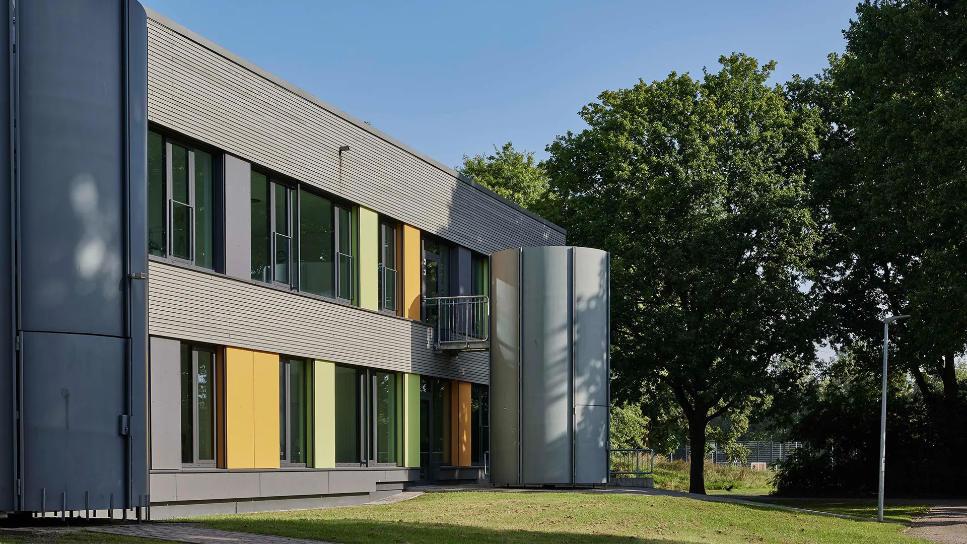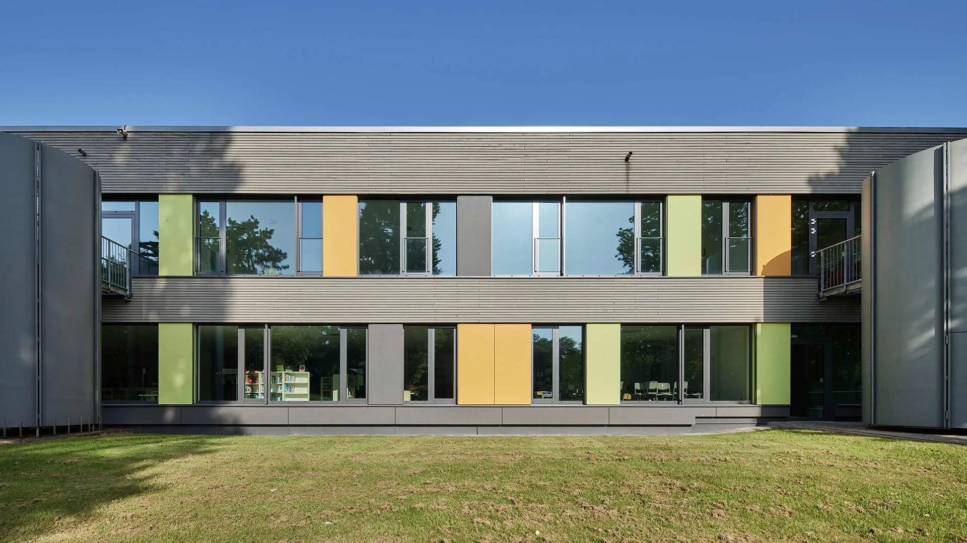 Der hohe Vorfertigungsgrad ermöglichte eine besonders kurze Bauzeit während der Sommerferien, sodass der Schulbetrieb nicht beeinträchtigt wurde. Gleichzeitig wurden Dach und Fassade energetisch auf den neuesten Stand gebracht: Der rechnerische Wärmeverlust konnte um mehr als die Hälfte reduziert werden.