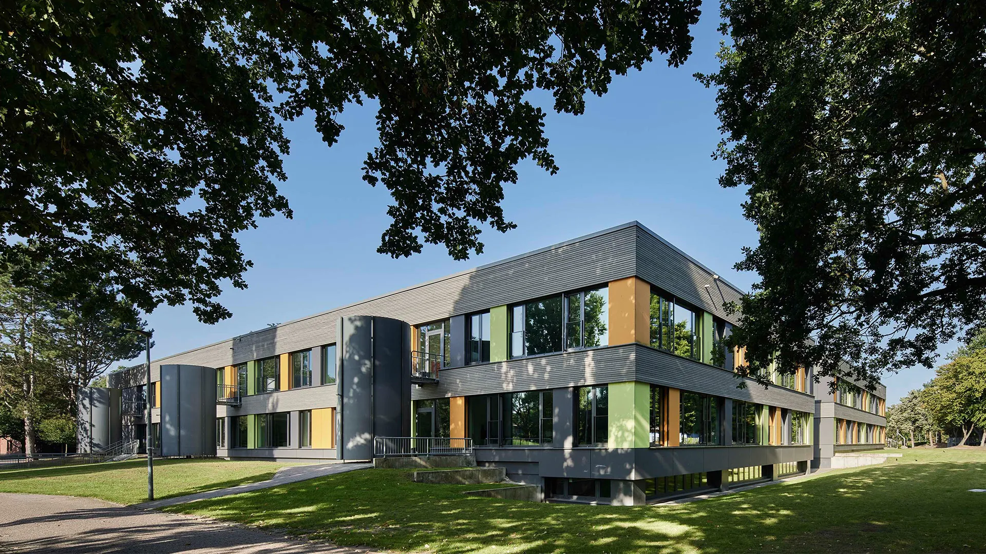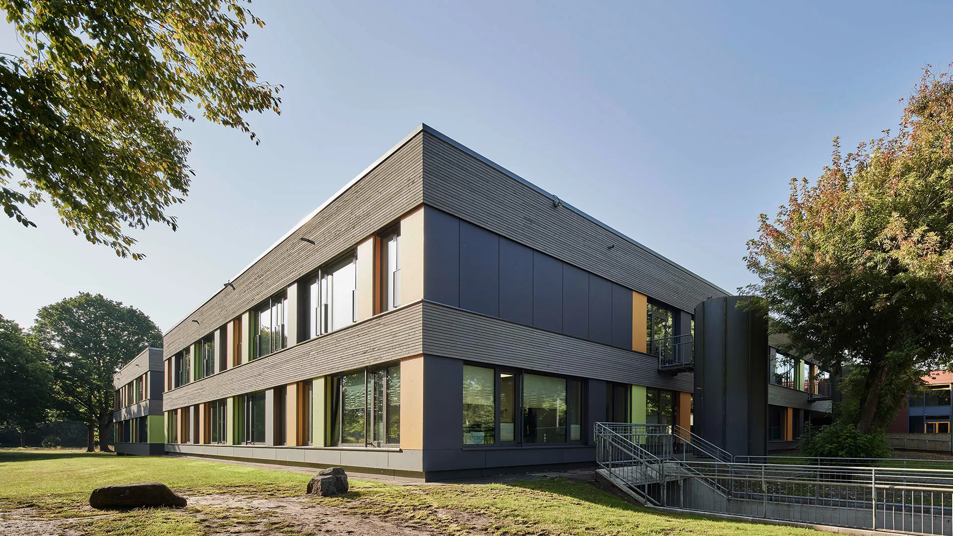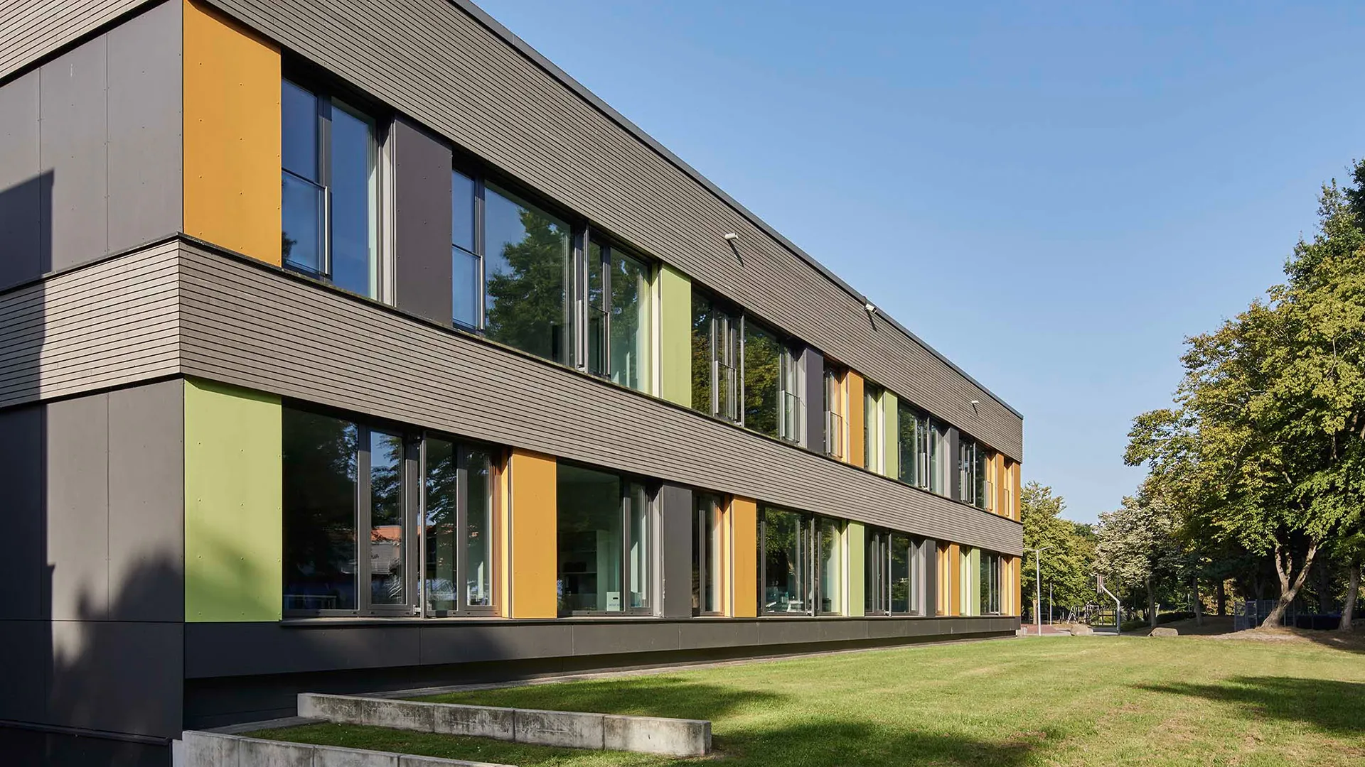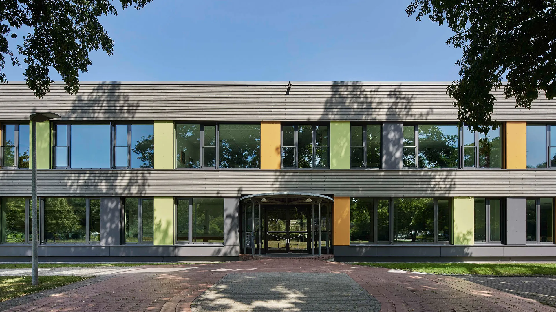 Der hohe Vorfertigungsgrad ermöglichte eine besonders kurze Bauzeit während der Sommerferien, sodass der Schulbetrieb nicht beeinträchtigt wurde. Gleichzeitig wurden Dach und Fassade energetisch auf den neuesten Stand gebracht: Der rechnerische Wärmeverlust konnte um mehr als die Hälfte reduziert werden.
