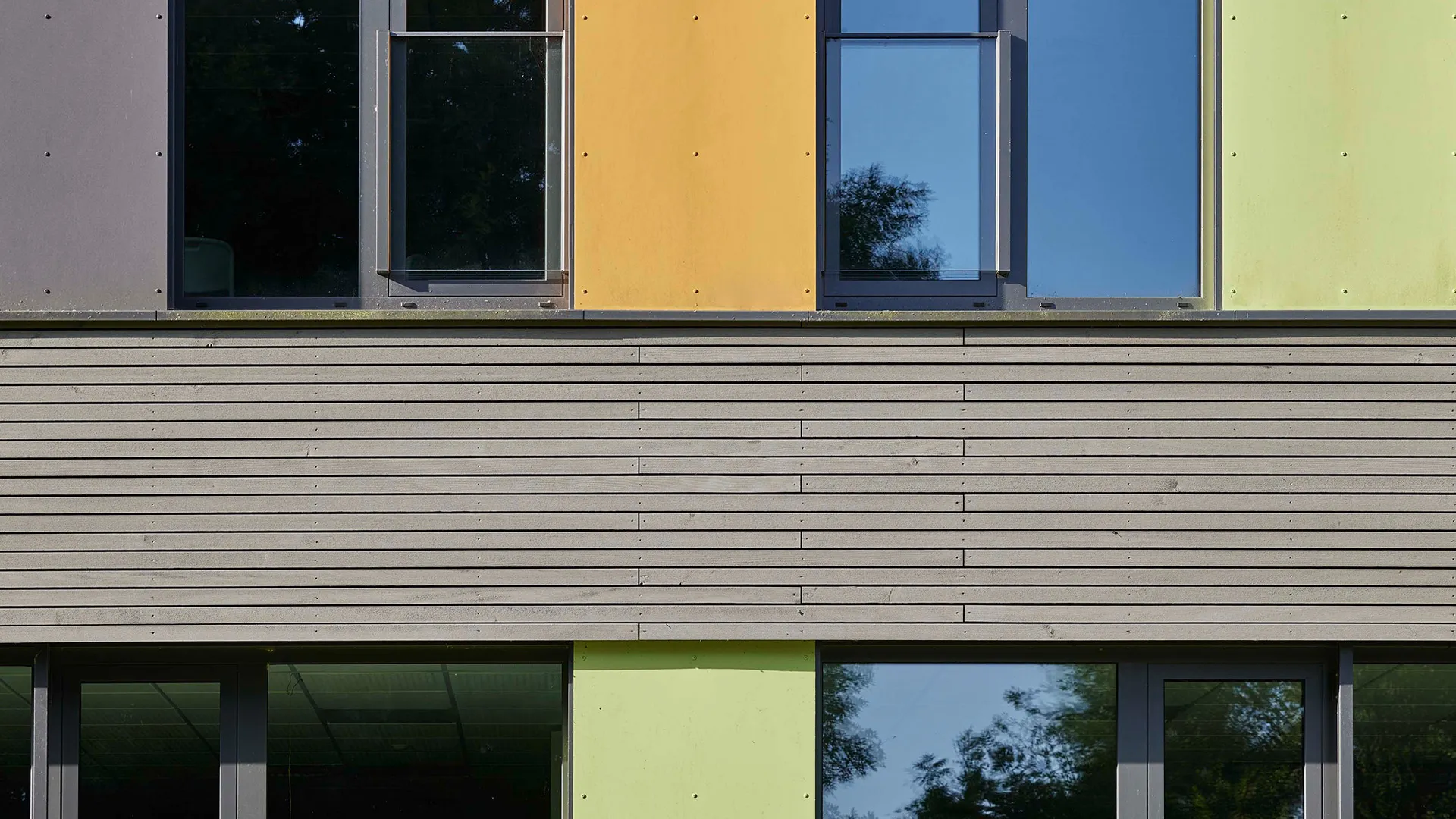 Für die IGS Kreyenbrück wurde eine umfassende Fassadensanierung in Holztafelbauweise realisiert. Dabei kamen geschosshohe Fassadenelemente zum Einsatz, die in unserem Werk mit sämtlichen Komponenten – von Fenstern und Fensterbänken über Dämmung und Sonnenschutz bis hin zu Abdichtungsfolien – vollständig vorgefertigt wurden. Anschließend erfolgte die präzise Montage auf der Baustelle. Insgesamt wurden rund 2.400 m² Fassadenfläche erneuert.