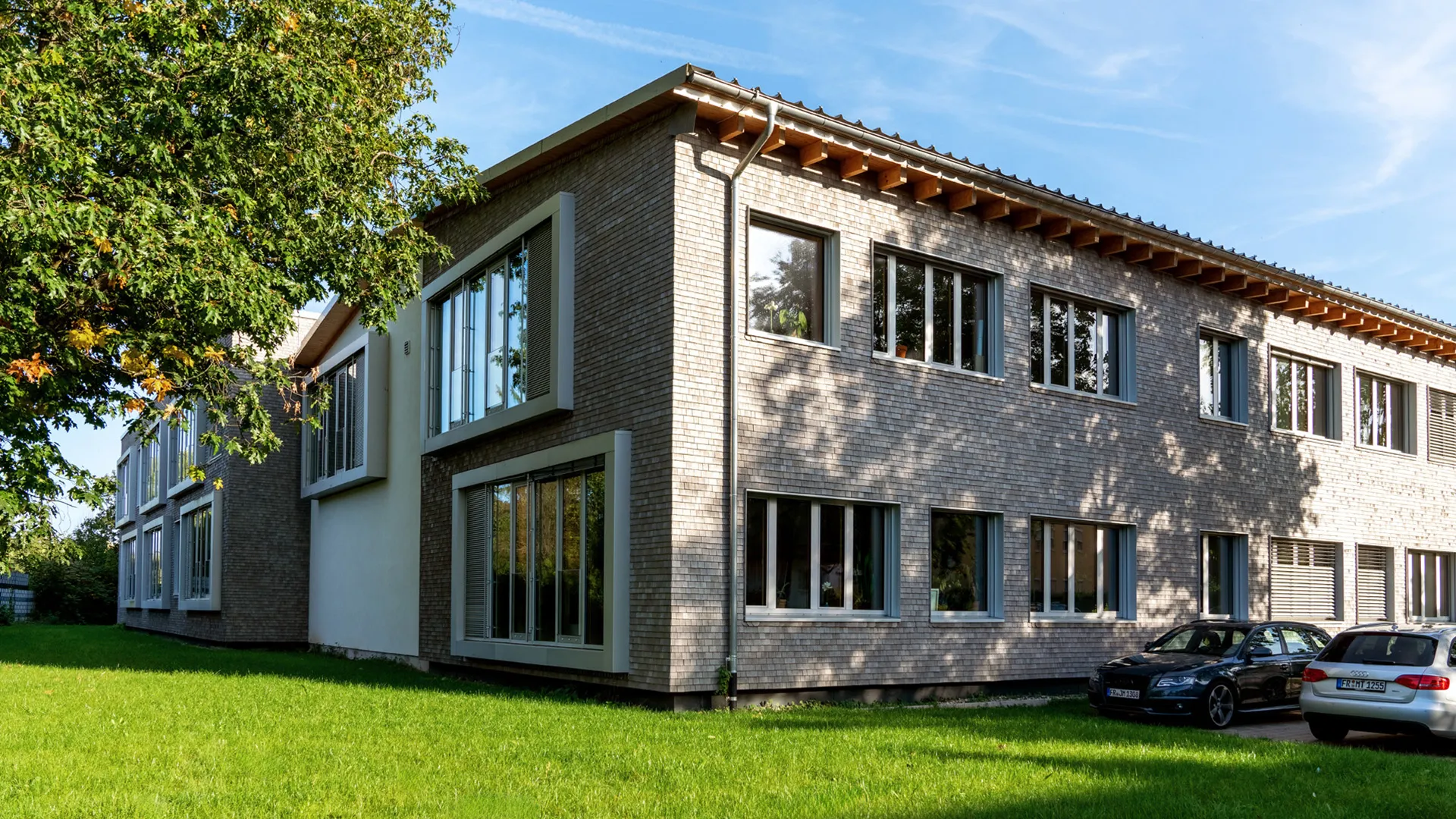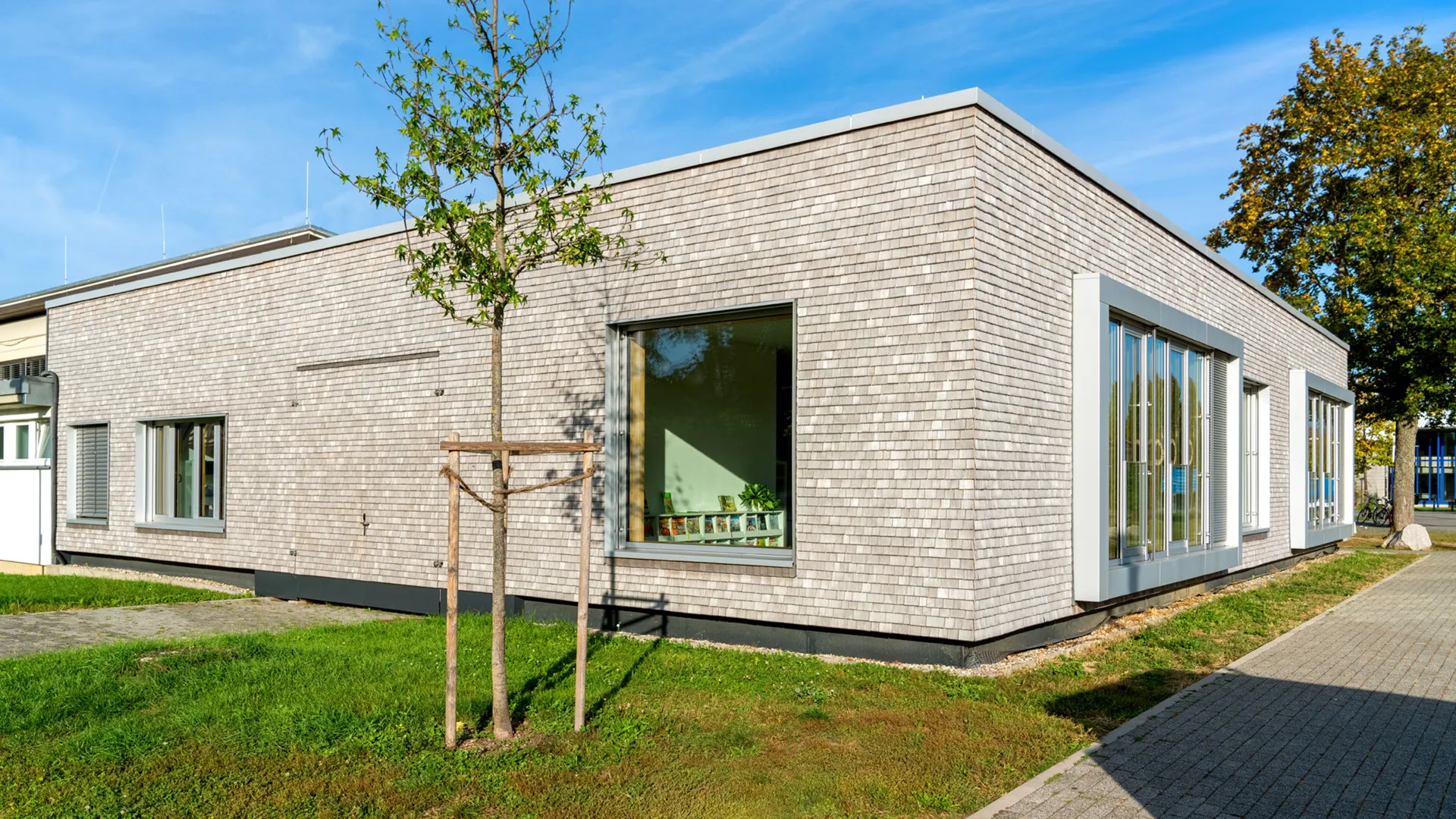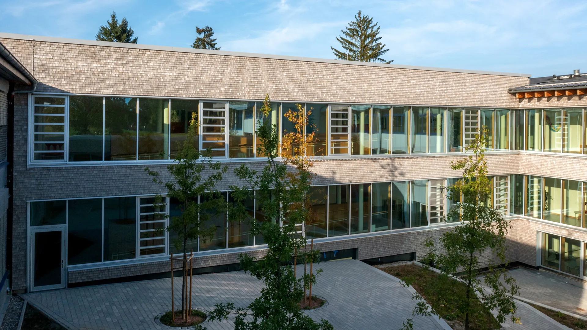 Die Holzschindeln aus dem Schwarzwald verleihen dem Gebäude ein lebendiges, langlebiges Fassadenbild. Gleichzeitig schaffen die tiefen Sitzerker eine gemütliche Lernatmosphäre, die den Schülern neue Räume für Rückzug und Austausch bietet. Mit der gelungenen Verbindung aus Funktionalität, Nachhaltigkeit und architektonischer Qualität ist ein zeitgemäßer Bildungsbau entstanden, der die Schulgemeinschaft stärkt.