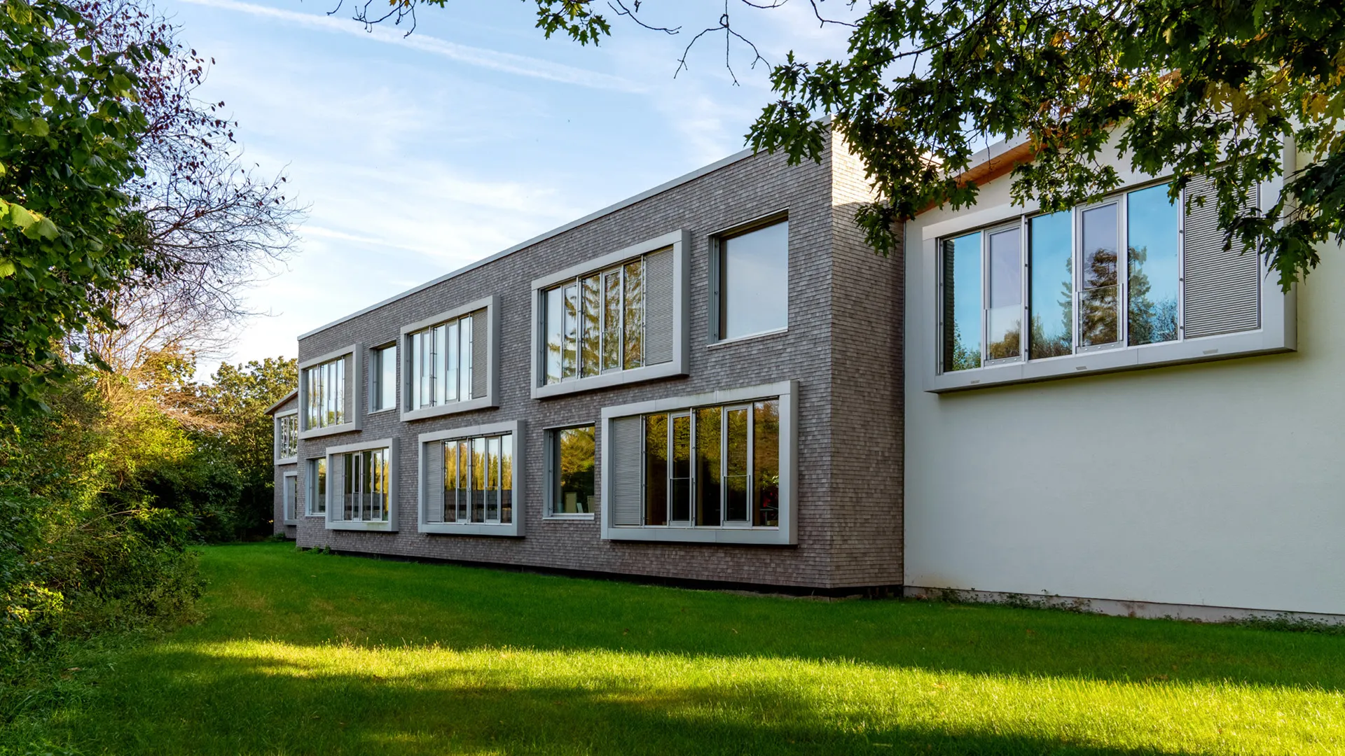 Wir von SIEVEKE lieferten und montierten sämtliche vorgefertigten Fassadenelemente, die mit einer integrierten Pfosten-Riegel-Konstruktion, fertig verglasten Fenstern, Lüftungstechnik und -gittern ausgestattet waren. Darüber hinaus fertigten wir die Sitzerker aus Eichenbrettschichtholz-Rahmen sowie die Kombination der Fassadenmaterialien aus Aluminium und regionalen Holzschindeln. Der hohe Vorfertigungsgrad ermöglichte eine schnelle und präzise Umsetzung bei laufendem Schulbetrieb.