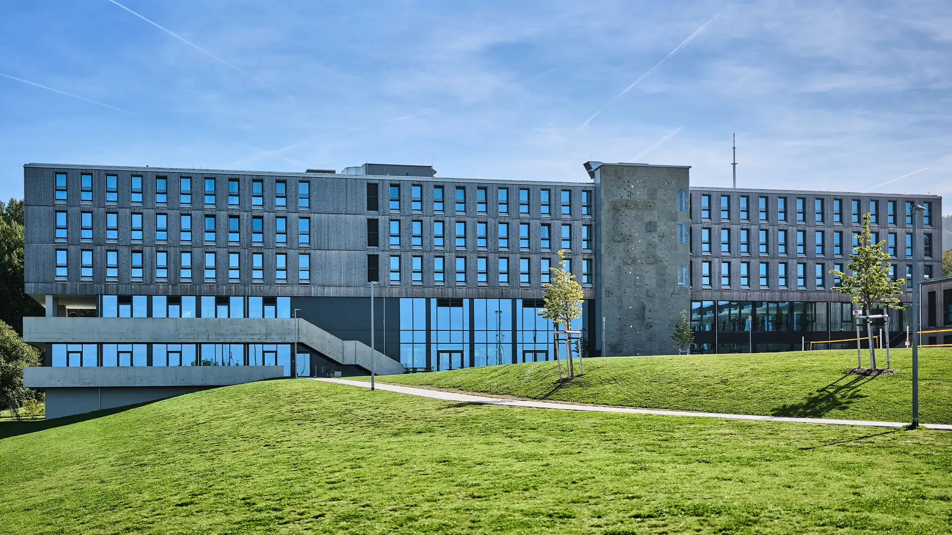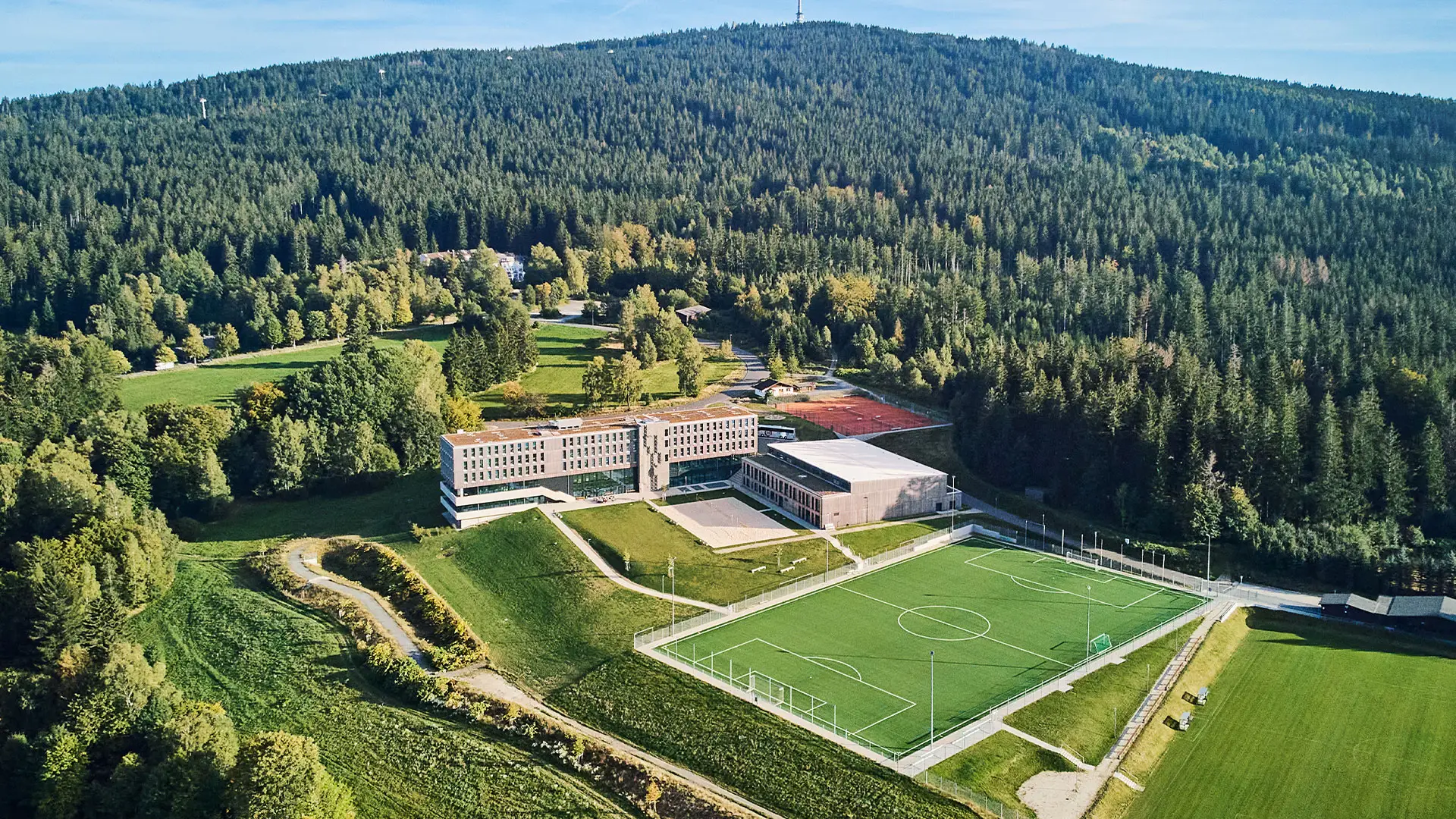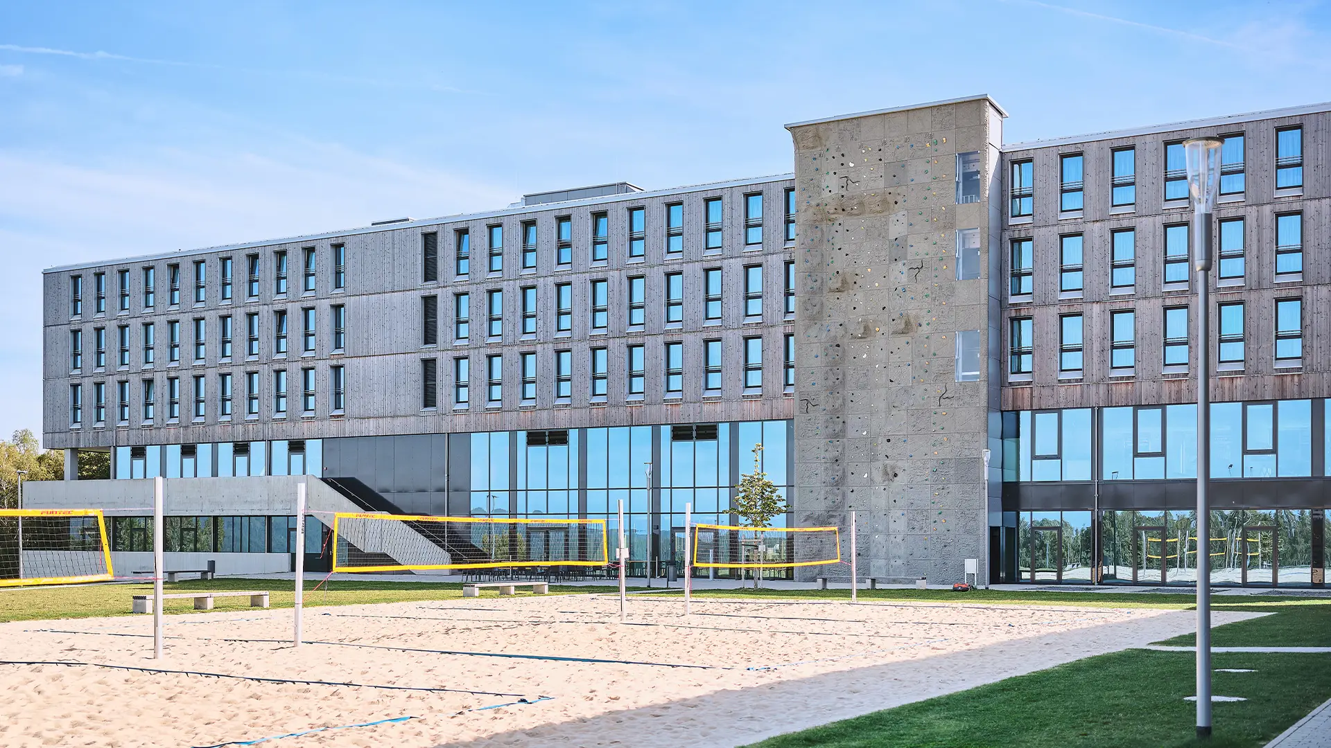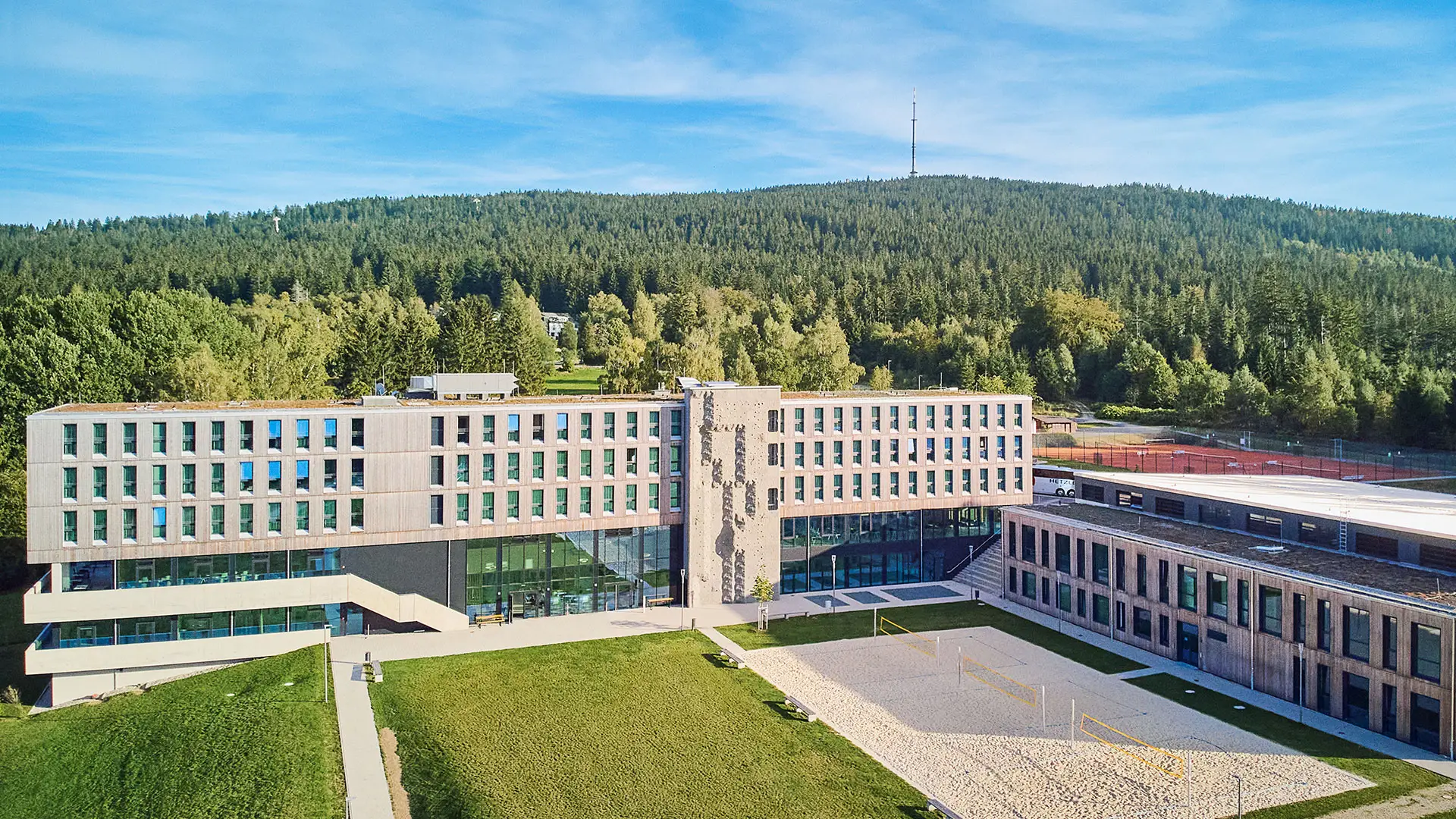 Das Hotel- und Sportgebäude wurde in Holzhybridbauweise errichtet und prägt das Sportcamp als zentrale Anlaufstelle. Der Baukörper wurde speziell auf die topographischen Anforderungen des Hanggrundstücks abgestimmt. Die oberen drei Geschosse sind mit einer hinterlüfteten Holzfassade verkleidet und setzen sich optisch von dem verglasten Sockelbau ab.