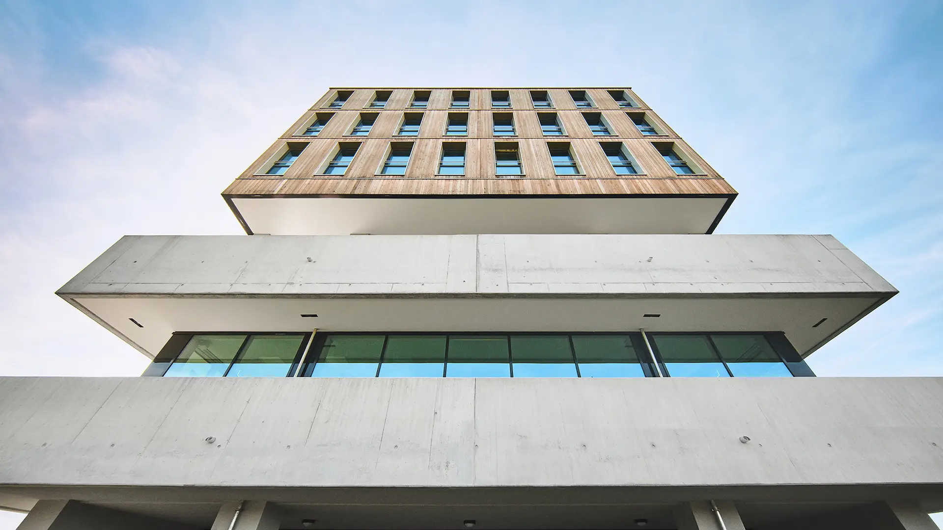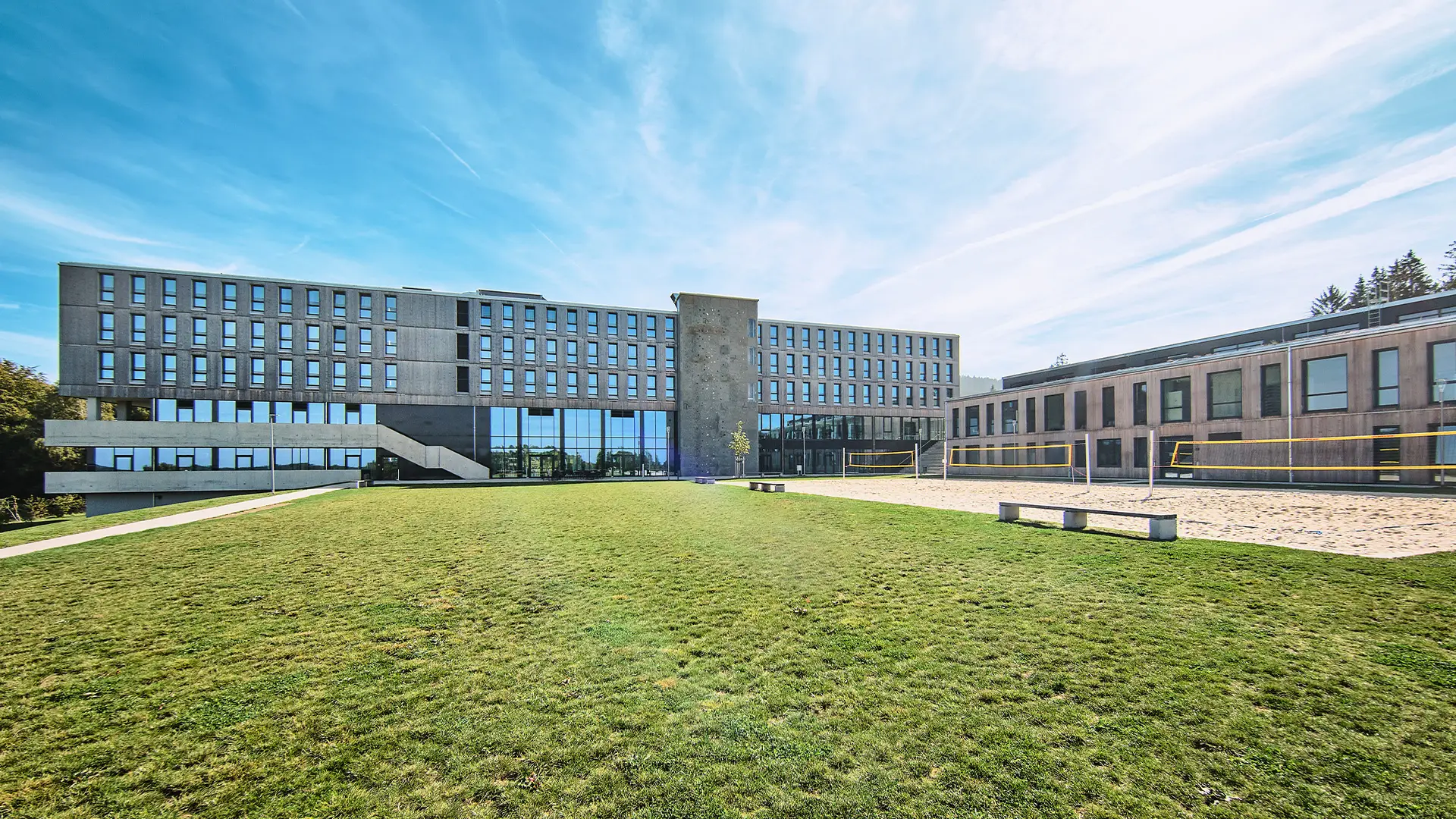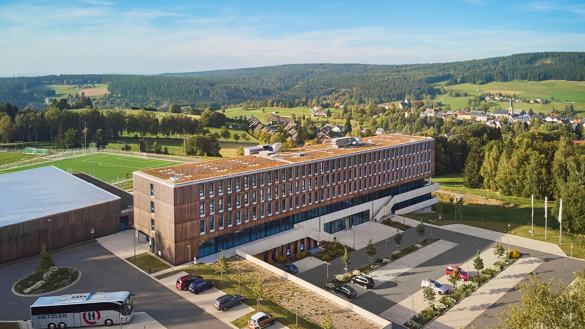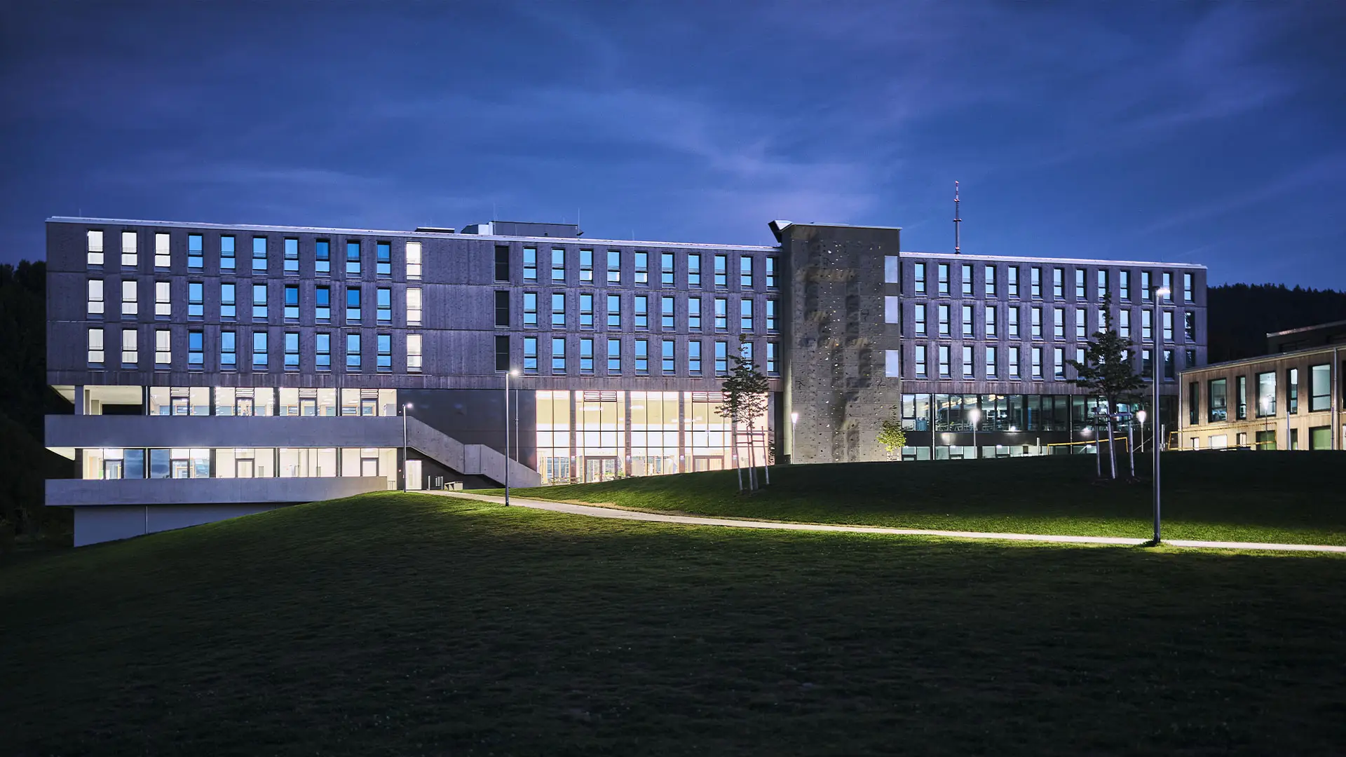Das Hotel- und Sportgebäude wurde in Holzhybridbauweise errichtet und prägt das Sportcamp als zentrale Anlaufstelle. Der Baukörper wurde speziell auf die topographischen Anforderungen des Hanggrundstücks abgestimmt. Die oberen drei Geschosse sind mit einer hinterlüfteten Holzfassade verkleidet und setzen sich optisch von dem verglasten Sockelbau ab.