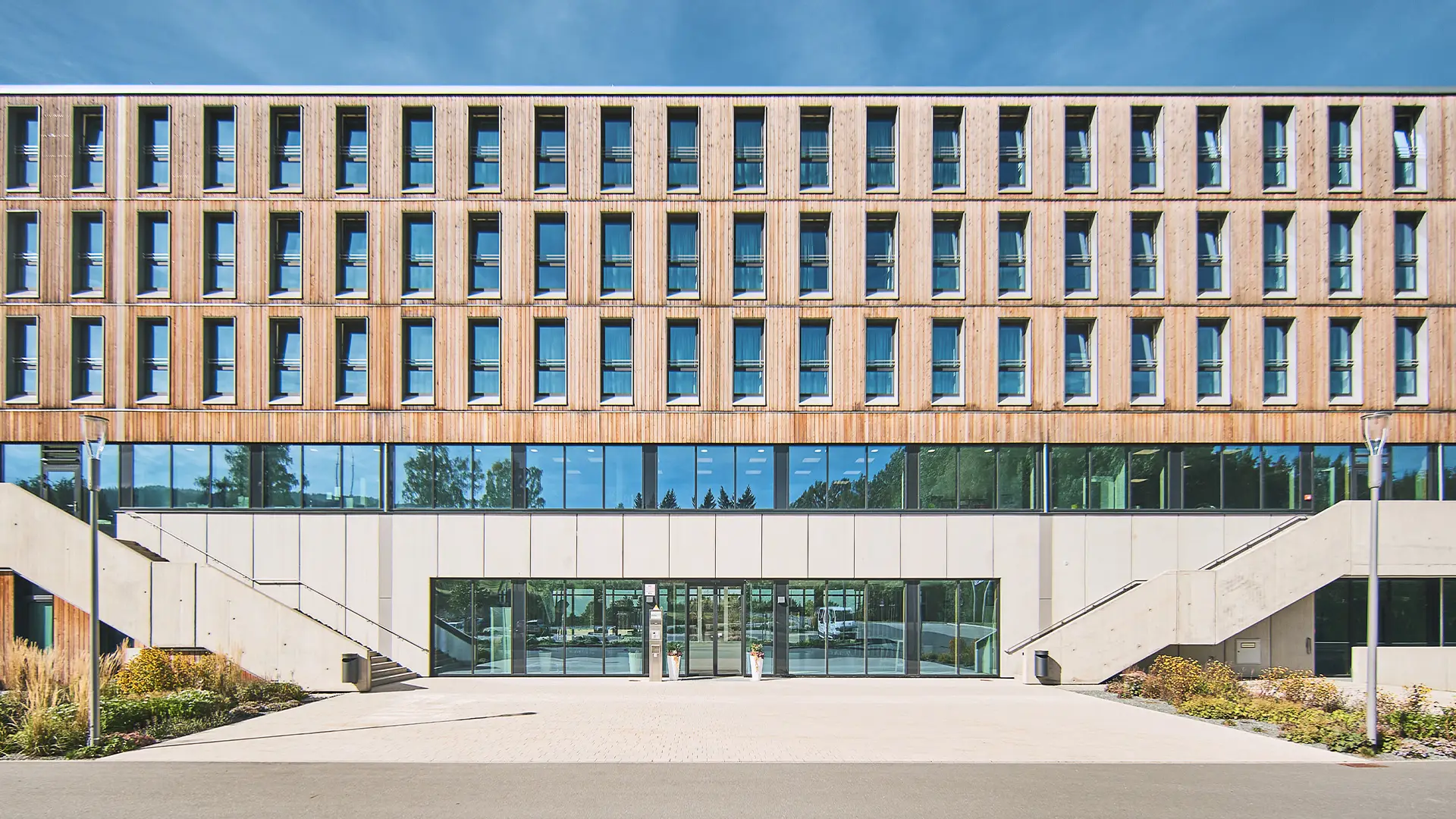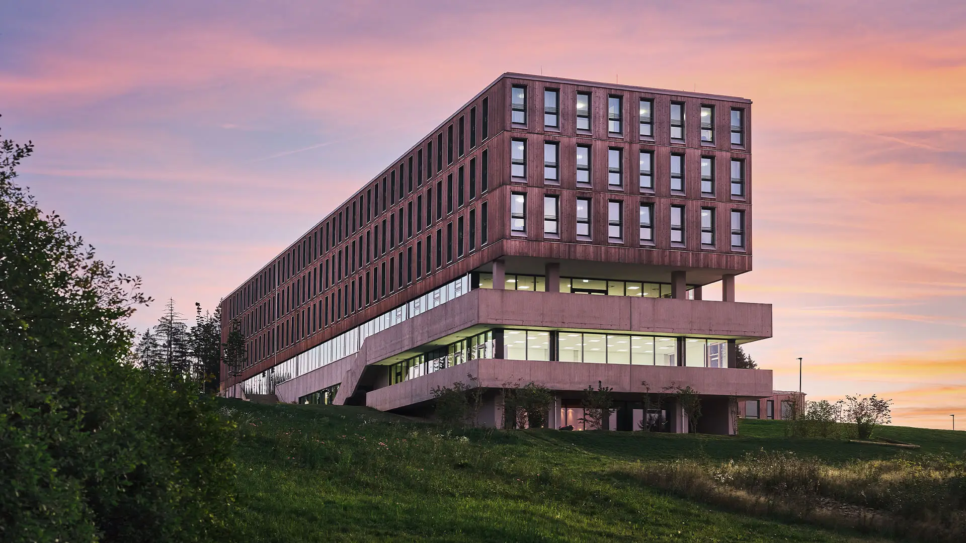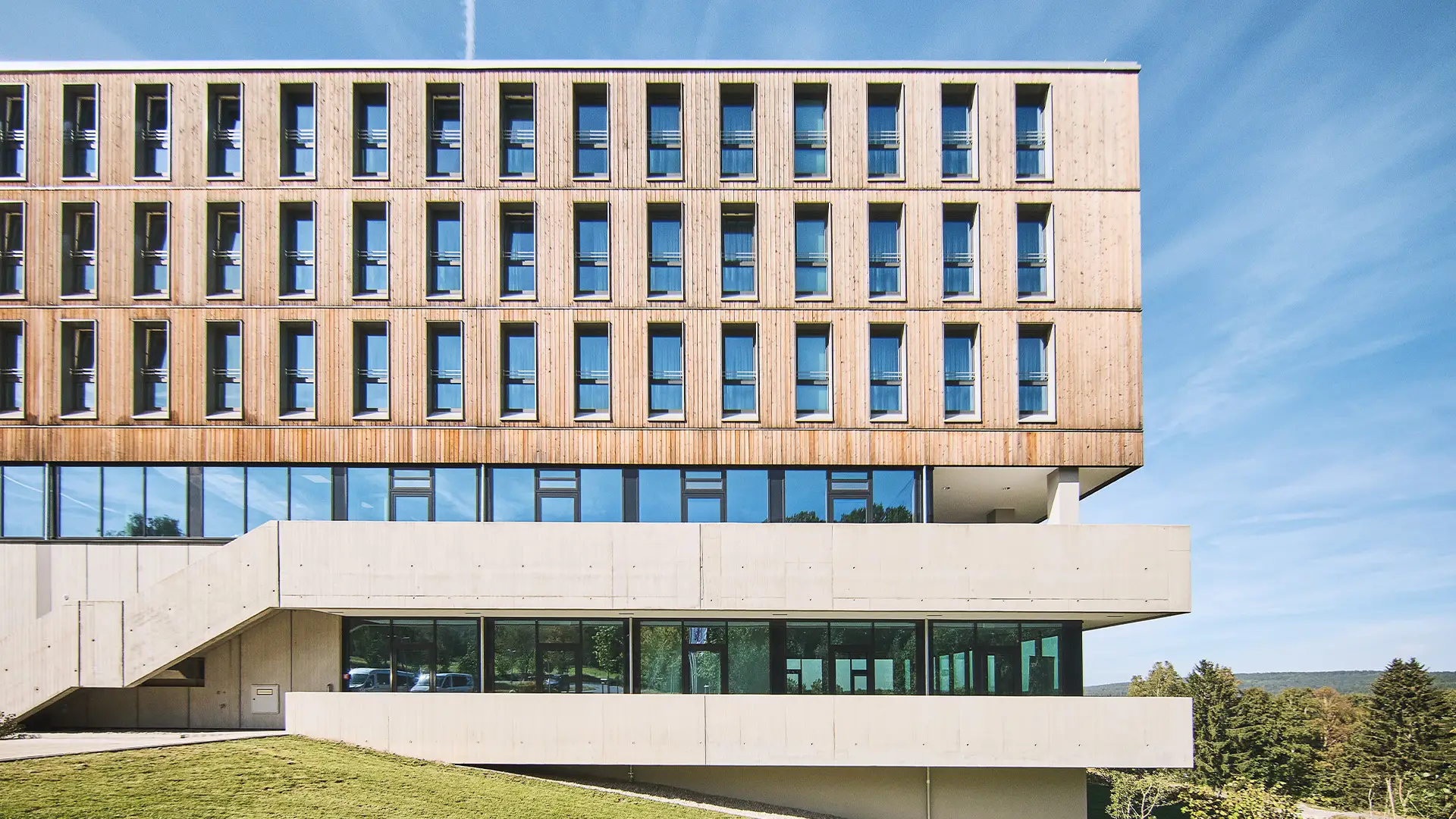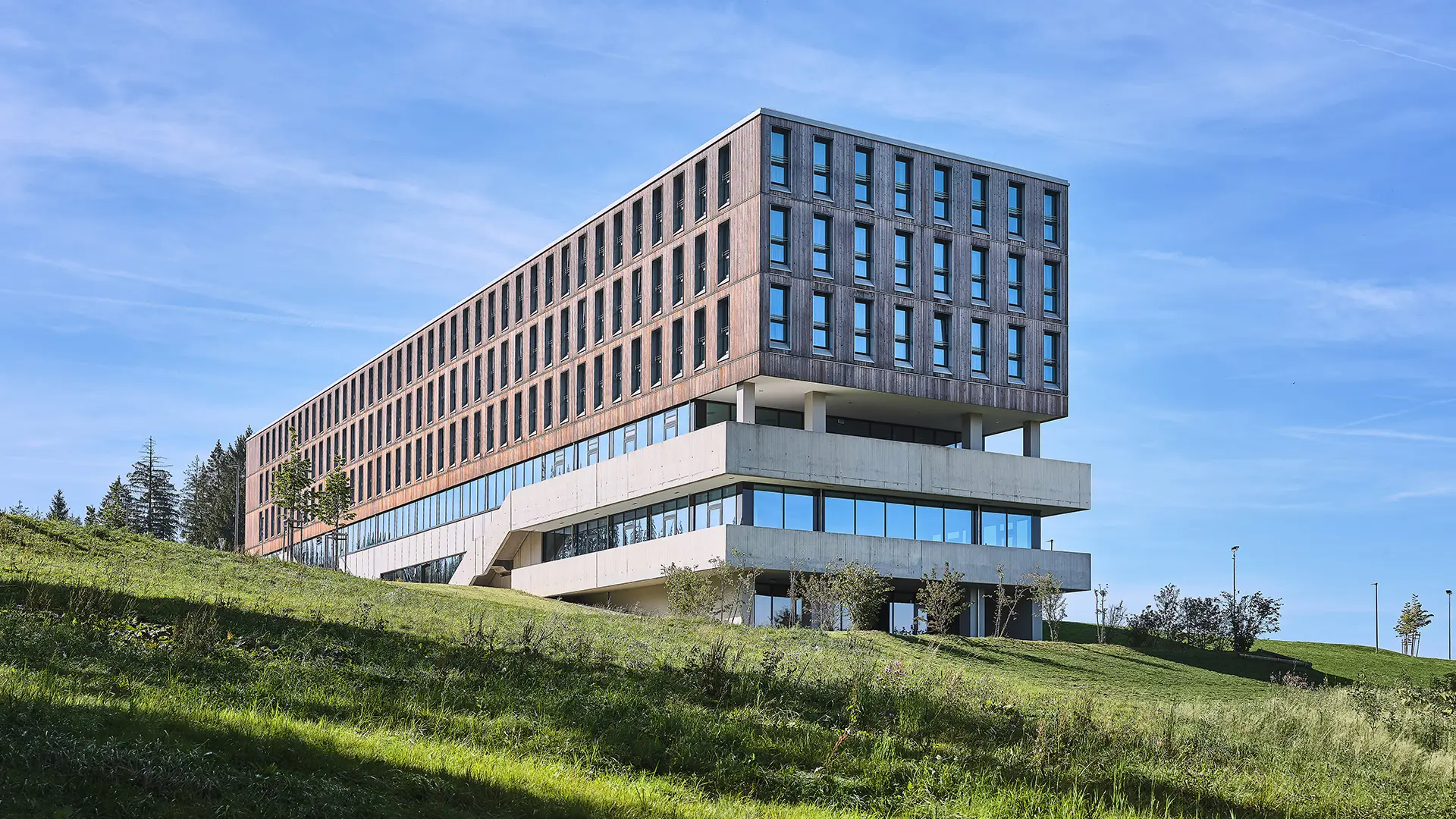 Dank einer hochwärmedämmten Gebäudehülle mit hinterlüfteter Holzfassade, die den Energie- und Wärmehaushalt der Innenräume reguliert.